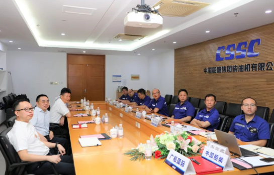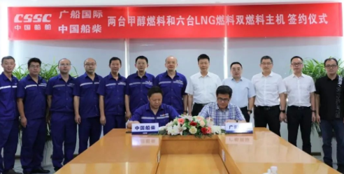 7月27日,中國船舶集團旗下中國動力子公司中國船柴與中國船舶集團所屬廣船國際,在中國船柴本部舉行兩臺甲醇燃料主機和六臺液化天然氣燃料主機合作協議簽約儀式。廣船國際董事長陳忠前、總工程師周木順,中國船柴董事長付向昭、副總經理楊小強、總工程師張光偉及雙方公司相關部門負責人出席儀式。