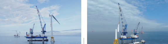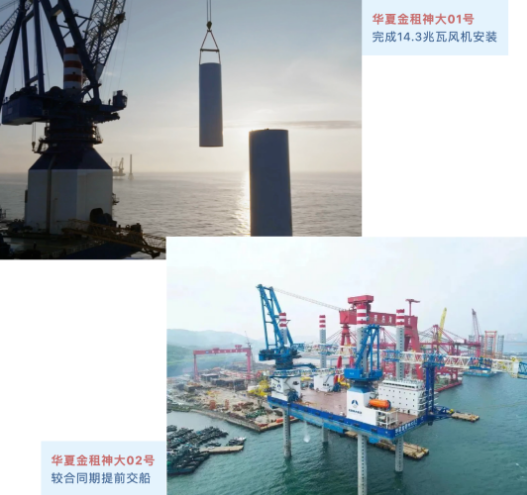 14.3兆瓦風機安裝是“華夏金租神大01號”在福建漳浦六鰲海上風電場二期中的“首秀”。該機組的輪轂中心高度149.5米,單鉤最大重量603噸。面對風急、浪高等自然環境的挑戰,1200噸主吊機和3300平方米的甲板面積以其優越的性能,有效地解決了大兆瓦風機的儲存、拼裝和吊裝問題;受力面積更大的樁靴和性能卓越的插拔樁系統,使得平臺能夠快速完成站樁和升降,對復雜海域有更強適應性;強大的穩定性和高精準的定位能力,為安全、高效地完成吊裝任務創造了有利條件,展現出了第四代風電安裝平臺的優越性。