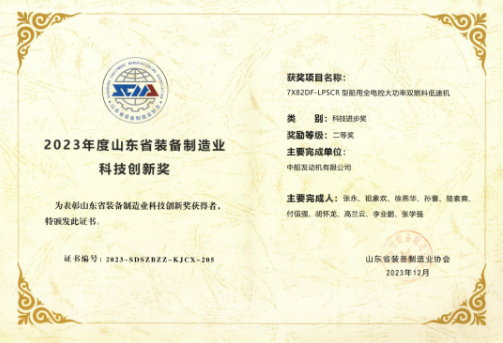 近日,山東省裝備制造業(yè)科技創(chuàng)新暨產(chǎn)業(yè)鏈綠色低碳高質(zhì)量發(fā)展大會(huì)圓滿落幕。由中國船舶集團(tuán)旗下中國動(dòng)力子公司中船發(fā)動(dòng)機(jī)主持的《7X82DF-LPSCR型船用全電控大功率雙燃料低速機(jī)》項(xiàng)目榮獲“山東省裝備制造業(yè)科技創(chuàng)新二等獎(jiǎng)”。