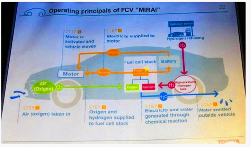 644km,聽到這個(gè)數(shù)字相信很多朋友估計(jì)都會(huì)有一些小小的激動(dòng),畢竟咱們國內(nèi)續(xù)航里程最高的電動(dòng)車差不多也就四五百公里了,而這臺(tái)車一來就是600多公里,這著實(shí)調(diào)動(dòng)了人們的興趣。而說到這臺(tái)豐田Mirai的原理其實(shí)也很簡單,它利用空氣中的氧氣(綠色)以及氣罐內(nèi)的氫氣(紅線)在發(fā)電裝置內(nèi)發(fā)生反應(yīng),產(chǎn)生的電能(橙線)輸送給電動(dòng)機(jī)用于驅(qū)動(dòng)車輛,剩余的電能則儲(chǔ)存在電池中,用于車輛急加速或?yàn)檐嚿系挠秒娫O(shè)備供電。化學(xué)反應(yīng)之后產(chǎn)生的水(藍(lán)線)直接排除車外即可。
