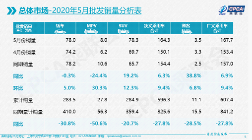 5月廠家批發(fā)銷量164.3萬輛,同比去年5月增長6.3%,環(huán)比4月增長9.4%。這也是自18年7月以來22個月后的首次批發(fā)正增長。1-5月累計批發(fā)銷量596.3萬輛,同比下降27.8%,減少229萬輛。