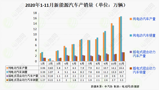 其中,11月,新能源汽車產(chǎn)銷分別完成19.8萬輛和20萬輛,同比分別增長(zhǎng)75.1%和104.9%,其單月產(chǎn)銷第5次刷新了當(dāng)月歷史記錄。其中純電動(dòng)汽車產(chǎn)銷分別完成16.4萬輛和16.7萬輛,同比分別增長(zhǎng)66.2%和100.5%;插電式混合動(dòng)力汽車產(chǎn)銷均完成3.3萬輛,同比分別增長(zhǎng)136.4%和128.9%;燃料電池汽車產(chǎn)銷分別完成288輛和290輛,同比分別增長(zhǎng)7.2倍和28倍。