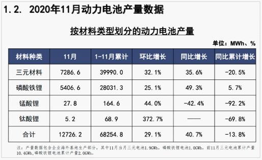 另外,中國(guó)汽車動(dòng)力電池產(chǎn)業(yè)創(chuàng)新聯(lián)盟發(fā)布的數(shù)據(jù)顯示,11月,我國(guó)動(dòng)力電池產(chǎn)量共計(jì)12.7GWh,同比增長(zhǎng)40.7%,環(huán)比增長(zhǎng)29.1%。其中三元電池產(chǎn)量7.3GWh,占總產(chǎn)量57.3%,同比增長(zhǎng)35.6%,環(huán)比增長(zhǎng)32.1%;磷酸鐵鋰電池產(chǎn)量5.4GWh,占總產(chǎn)量42.5%,同比增長(zhǎng)49.3%,環(huán)比增長(zhǎng)25.1%。1-11月,我國(guó)動(dòng)力電池產(chǎn)量累計(jì)68.3GWh,同比累計(jì)下降13.8%。其中三元電池產(chǎn)量累計(jì)40.0GWh,占總產(chǎn)量58.6%,同比累計(jì)下降20.5%;磷酸鐵鋰電池產(chǎn)量累計(jì)28.0GWh,占總產(chǎn)量41.1%,同比累計(jì)上升5.7%。