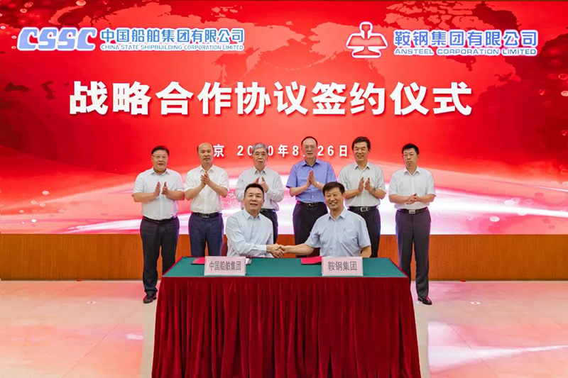 8月26日,中國船舶集團有限公司與鞍鋼集團有限公司在京簽署戰略合作協議。中國船舶集團黨組書記、董事長雷凡培,黨組成員、副總經理馮永強,鞍鋼集團黨委書記、董事長譚成旭,黨委副書記、總經理戴志浩出席簽約儀式。中國船舶集團黨組成員、副總經理孫偉,鞍鋼集團黨委常委、副總經理王義棟分別代表雙方在協議上簽字。