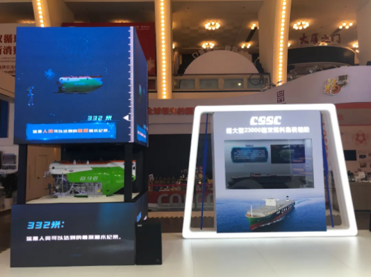 進(jìn)入中國(guó)船舶展廳,觀眾不僅能夠看到“奮斗者”號(hào)全海深載人潛水器、“雪龍2”號(hào)極地科考船等多個(gè)高科技品牌產(chǎn)品,還可以通過(guò)航空母艦、常規(guī)動(dòng)力潛艇、驅(qū)逐艦、護(hù)衛(wèi)艦?zāi)P土私馕覈?guó)國(guó)防裝備實(shí)力。