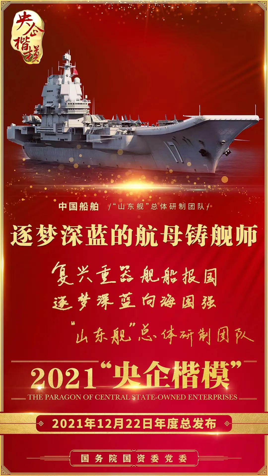 12月22日,國務(wù)院國資委黨委舉行2021年第二批“央企楷模”發(fā)布暨年度總發(fā)布儀式,中國船舶“山東艦”總體研制團隊榮獲2021年“央企楷模”榮譽稱號。繼“奮斗者”號萬米載人潛水器研發(fā)團隊獲評2020年“央企楷模”榮譽稱號后,中國船舶集團再獲此殊榮。