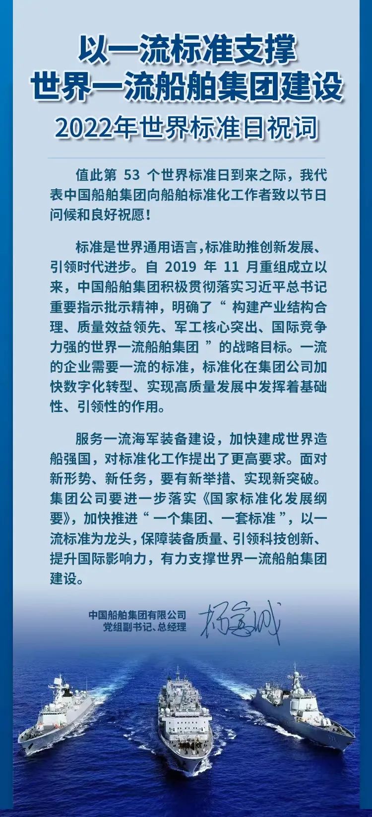 中國(guó)船舶集團(tuán)有限公司黨組副書記、總經(jīng)理?xiàng)罱鸪芍伦T~,強(qiáng)調(diào)集團(tuán)公司要進(jìn)一步落實(shí)《國(guó)家標(biāo)準(zhǔn)化發(fā)展綱要》,加快推進(jìn)“一個(gè)集團(tuán)、一套標(biāo)準(zhǔn)”,以一流標(biāo)準(zhǔn)為龍頭,保障裝備質(zhì)量、引領(lǐng)科技創(chuàng)新、提升國(guó)際影響力,有力支撐世界一流船舶集團(tuán)建設(shè),以優(yōu)異的成績(jī)迎接黨的二十大勝利召開。