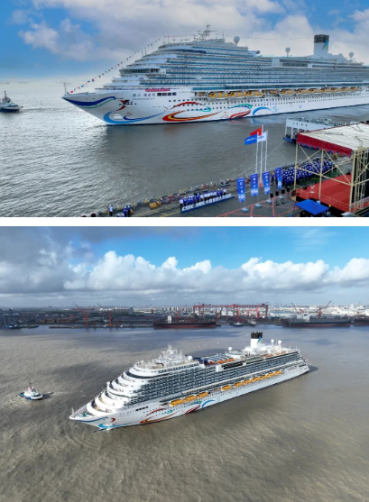 7月17日清晨7時許,隨著中國船舶集團有限公司黨組書記、董事長溫剛一聲令下,白色涂裝、流線型船體、身系“敦煌飛天彩帶”的首艘國產大型郵輪“愛達·魔都號”緩緩駛出中國船舶集團外高橋造船4號碼頭,正式出海試航。集團公司黨組成員、副總經理盛紀綱出席試航出征儀式并致辭。