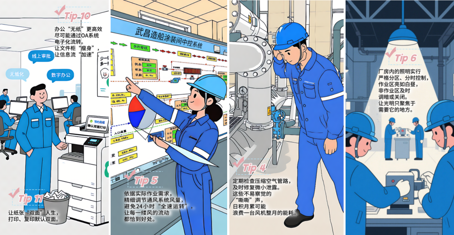 武昌造船在節(jié)能宣傳周期間組織開展了“船廠節(jié)能秘籍”征集活動,以船廠員工的一天為軸線,收集到各類節(jié)能基本操作,形成了《這些基本操作,我知道你一定能做到》宣傳材料,并通過公司公眾號發(fā)布,向員工普及節(jié)能知識與技巧,擴大節(jié)能宣傳覆蓋面。同時開展 “停用空調(diào)”能源緊缺體驗行動,倡議全體員工在全國低碳日,關閉辦公室、會議室及非必要區(qū)域空調(diào)設備,通過實際行動感受能源緊缺,踐行節(jié)能理念,進一步增強員工資源憂患意識。