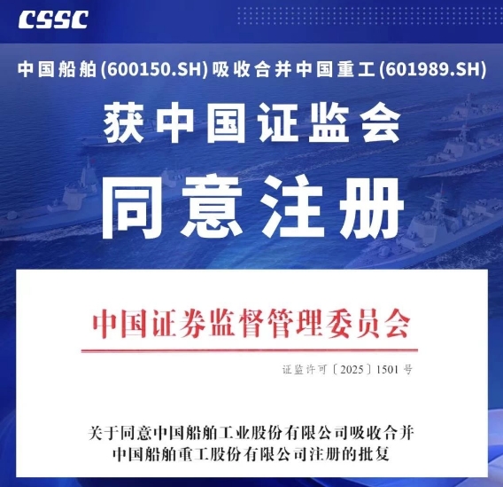 7月18日,中國證監(jiān)會(huì)發(fā)布《關(guān)于同意中國船舶工業(yè)股份有限公司吸收合并中國船舶重工股份有限公司注冊的批復(fù)》,同意中國船舶工業(yè)股份有限公司換股吸收合并中國船舶重工股份有限公司。