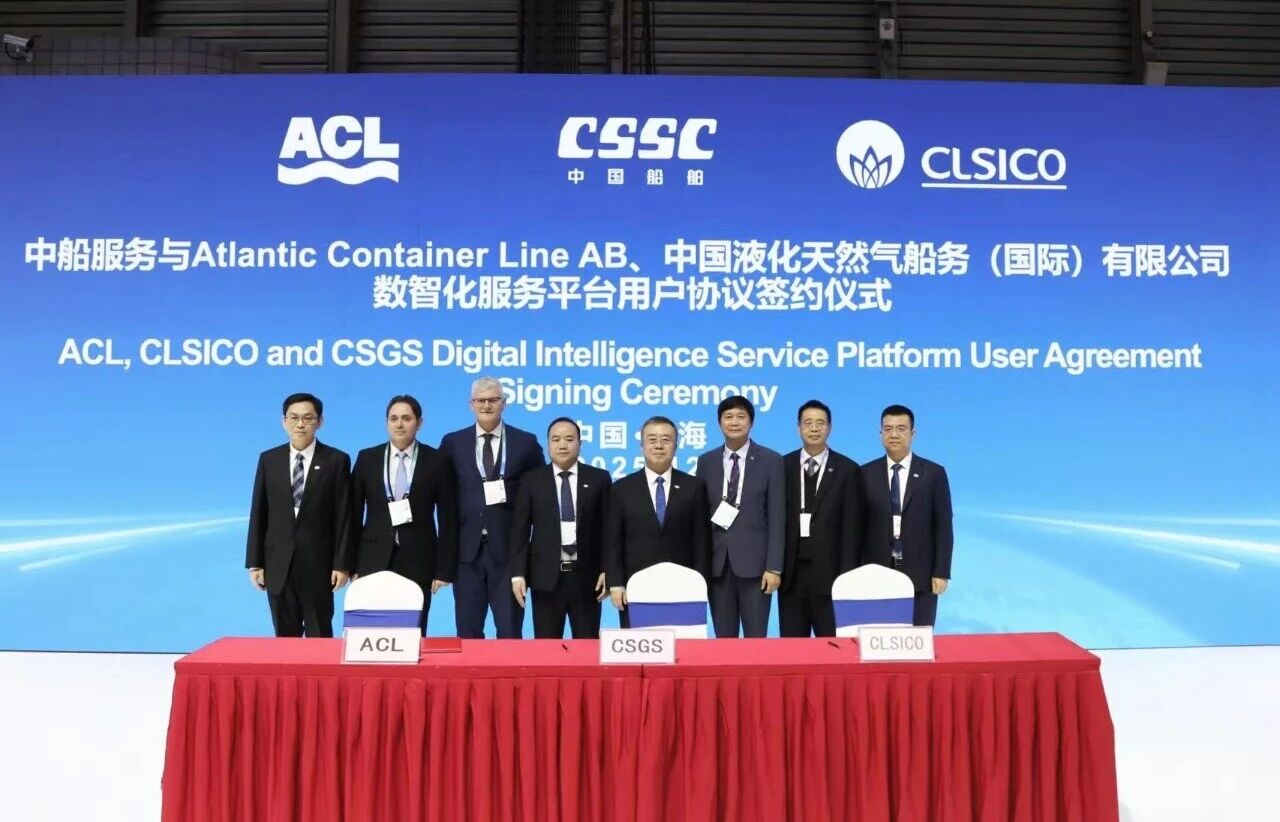 中國液化天然氣船務(國際)有限公司(CLSICO)與意大利Grimaldi集團旗下Atlantic Container Line(ACL)作為中船服務的長協服務簽約客戶,與中船服務正式簽訂數智化服務平臺用戶協議,標志著CSGS品牌首批標桿客戶成功落地。這一合作不僅體現了客戶對中船集團整船服務能力的信任,也為CSGS全球服務品牌的推廣樹立了典范。