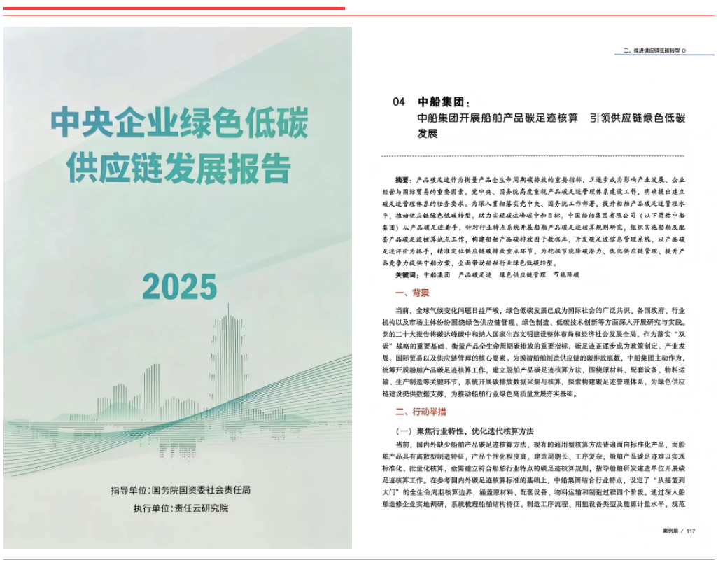 《中船集團開展船舶產品碳足跡核算引領綠色供應鏈低碳發展》聚焦船舶產品全生命周期碳足跡核算,構建了行業首套核算規則與數據庫,有效帶動供應鏈上下游協同減排。該案例入選《中央企業綠色低碳供應鏈發展報告(2025)》。